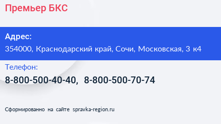 Премьер БКС по адресу 354000, Краснодарский край, Сочи, Московская, 3 к4 в дальнейшем Организация, размещена в следующих категориях: