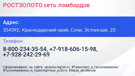 РОСТЗОЛОТО, сеть ломбардов по адресу 354392, Краснодарский край, Сочи, Эстонская, 23 в дальнейшем Организация, размещена в следующих категориях: