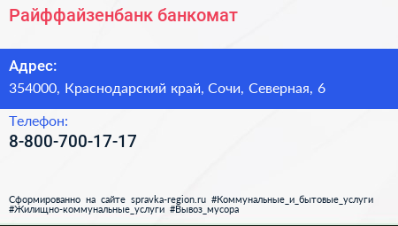Райффайзенбанк, банкомат по адресу 354000, Краснодарский край, Сочи, Северная, 6 в дальнейшем Организация, размещена в следующих категориях: