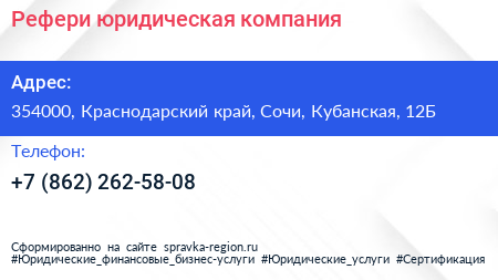 Рефери, юридическая компания по адресу 354000, Краснодарский край, Сочи, Кубанская, 12Б в дальнейшем Организация, размещена в следующих категориях: