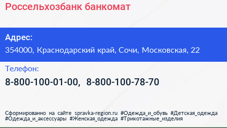 Россельхозбанк, банкомат по адресу 354000, Краснодарский край, Сочи, Московская, 22 в дальнейшем Организация, размещена в следующих категориях: