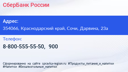 СберБанк России по адресу 354066, Краснодарский край, Сочи, Дарвина, 23а в дальнейшем Организация, размещена в следующих категориях: