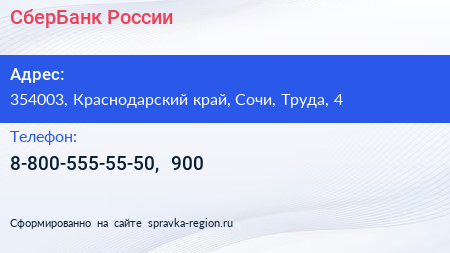 СберБанк России по адресу 354003, Краснодарский край, Сочи, Труда, 4 в дальнейшем Организация, размещена в следующих категориях: