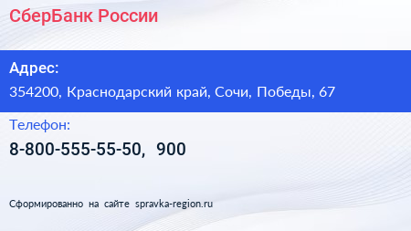 СберБанк России по адресу 354200, Краснодарский край, Сочи, Победы, 67 в дальнейшем Организация, размещена в следующих категориях: