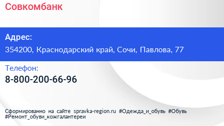 Совкомбанк по адресу 354200, Краснодарский край, Сочи, Павлова, 77 в дальнейшем Организация, размещена в следующих категориях: