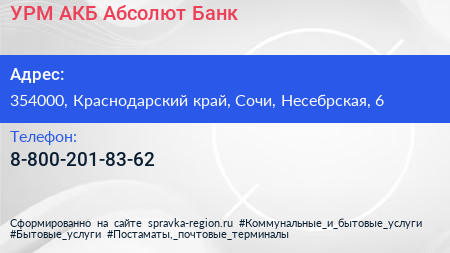 УРМ АКБ Абсолют Банк по адресу 354000, Краснодарский край, Сочи, Несебрская, 6 в дальнейшем Организация, размещена в следующих категориях: