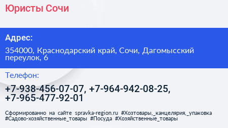 Юристы Сочи по адресу 354000, Краснодарский край, Сочи, Дагомысский переулок, 6 в дальнейшем Организация, размещена в следующих категориях: