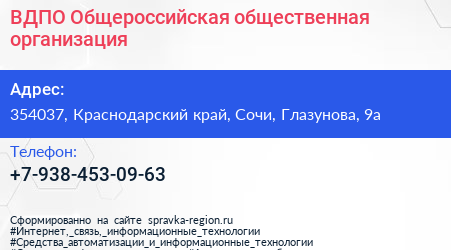 ВДПО, Общероссийская общественная организация по адресу 354037, Краснодарский край, Сочи, Глазунова, 9а в дальнейшем Организация, размещена в следующих категориях: