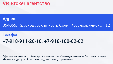 VR Broker, агентство по адресу 354065, Краснодарский край, Сочи, Красноармейская, 12 в дальнейшем Организация, размещена в следующих категориях: