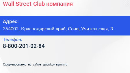 Wall Street Club, компания по адресу 354002, Краснодарский край, Сочи, Учительская, 3 в дальнейшем Организация, размещена в следующих категориях: