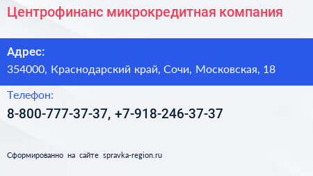 Центрофинанс, микрокредитная компания по адресу 354000, Краснодарский край, Сочи, Московская, 18 в дальнейшем Организация, размещена в следующих категориях: