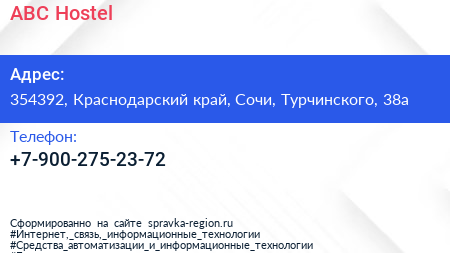 ABC-Hostel по адресу 354392, Краснодарский край, Сочи, Турчинского, 38а в дальнейшем Организация, размещена в следующих категориях: