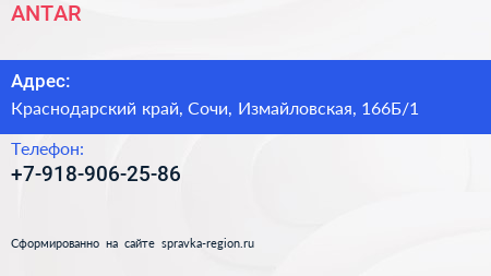 ANTAR по адресу Краснодарский край, Сочи, Измайловская, 166Б/1 в дальнейшем Организация, размещена в следующих категориях: