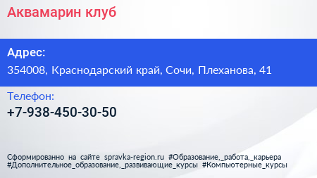 Аквамарин, клуб по адресу 354008, Краснодарский край, Сочи, Плеханова, 41 в дальнейшем Организация, размещена в следующих категориях: