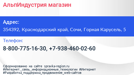 АльпИндустрия, магазин по адресу 354392, Краснодарский край, Сочи, Горная Карусель, 5 в дальнейшем Организация, размещена в следующих категориях: