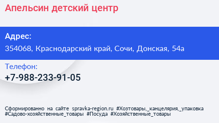 Апельсин, детский центр по адресу 354068, Краснодарский край, Сочи, Донская, 54а в дальнейшем Организация, размещена в следующих категориях: