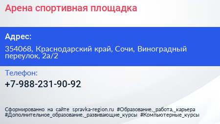 Арена, спортивная площадка по адресу 354068, Краснодарский край, Сочи, Виноградный переулок, 2а/2 в дальнейшем Организация, размещена в следующих категориях: