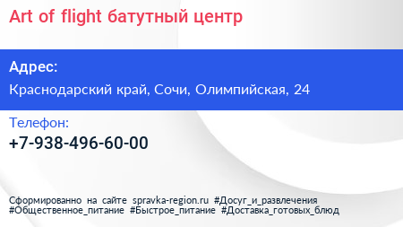 Art of flight, батутный центр по адресу Краснодарский край, Сочи, Олимпийская, 24 в дальнейшем Организация, размещена в следующих категориях: