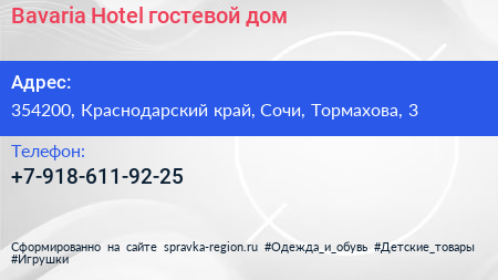 Bavaria Hotel, гостевой дом по адресу 354200, Краснодарский край, Сочи, Тормахова, 3 в дальнейшем Организация, размещена в следующих категориях: