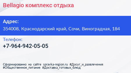 Bellagio, комплекс отдыха по адресу 354008, Краснодарский край, Сочи, Виноградная, 184 в дальнейшем Организация, размещена в следующих категориях: