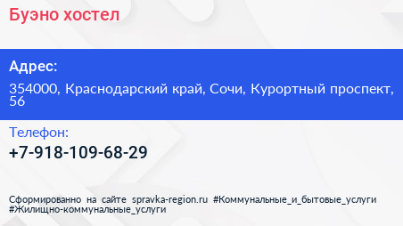 Буэно, хостел по адресу 354000, Краснодарский край, Сочи, Курортный проспект, 56 в дальнейшем Организация, размещена в следующих категориях: