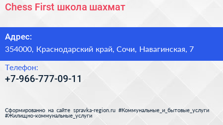 Chess First, школа шахмат по адресу 354000, Краснодарский край, Сочи, Навагинская, 7 в дальнейшем Организация, размещена в следующих категориях: