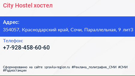 City Hostel, хостел по адресу 354057, Краснодарский край, Сочи, Параллельная, 9 лит3 в дальнейшем Организация, размещена в следующих категориях: