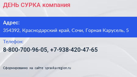 ДЕНЬ СУРКА, компания по адресу 354392, Краснодарский край, Сочи, Горная Карусель, 5 в дальнейшем Организация, размещена в следующих категориях: