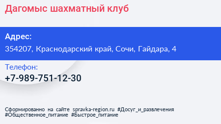 Дагомыс, шахматный клуб по адресу 354207, Краснодарский край, Сочи, Гайдара, 4 в дальнейшем Организация, размещена в следующих категориях: