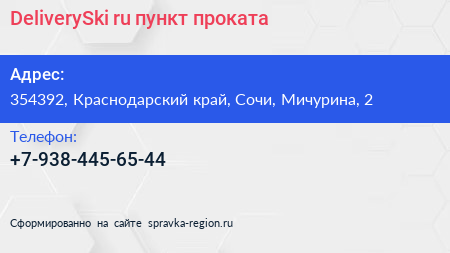 DeliverySki.ru, пункт проката по адресу 354392, Краснодарский край, Сочи, Мичурина, 2 в дальнейшем Организация, размещена в следующих категориях: