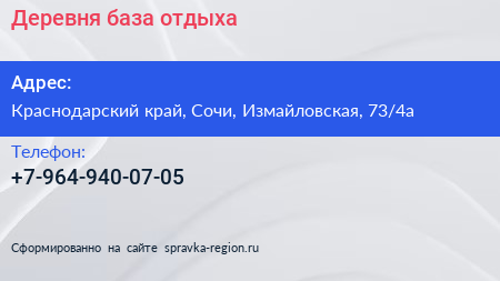 Деревня, база отдыха по адресу Краснодарский край, Сочи, Измайловская, 73/4а в дальнейшем Организация, размещена в следующих категориях: