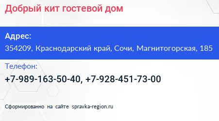 Добрый кит, гостевой дом по адресу 354209, Краснодарский край, Сочи, Магнитогорская, 185 в дальнейшем Организация, размещена в следующих категориях: