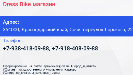 Dress Bike, магазин по адресу 354000, Краснодарский край, Сочи, переулок Горького, 22 в дальнейшем Организация, размещена в следующих категориях: