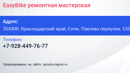 EasyBike, ремонтная мастерская по адресу 354200, Краснодарский край, Сочи, Павлова переулок, 133 в дальнейшем Организация, размещена в следующих категориях: