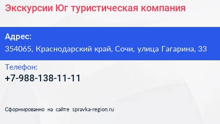 Экскурсии-Юг, туристическая компания по адресу 354065, Краснодарский край, Сочи, улица Гагарина, 33 в дальнейшем Организация, размещена в следующих категориях: