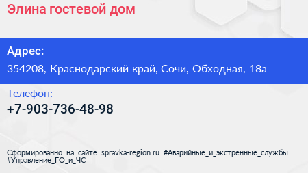 Элина, гостевой дом по адресу 354208, Краснодарский край, Сочи, Обходная, 18а в дальнейшем Организация, размещена в следующих категориях: