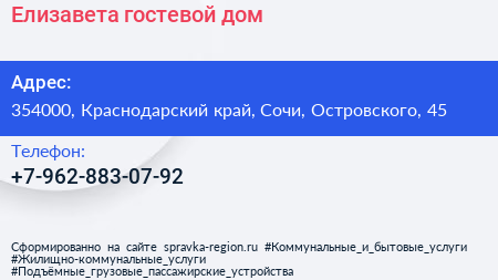 Елизавета, гостевой дом по адресу 354000, Краснодарский край, Сочи, Островского, 45 в дальнейшем Организация, размещена в следующих категориях: