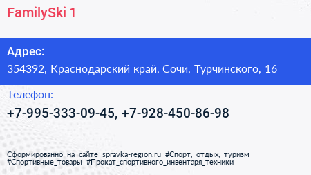FamilySki №1 по адресу 354392, Краснодарский край, Сочи, Турчинского, 16 в дальнейшем Организация, размещена в следующих категориях: