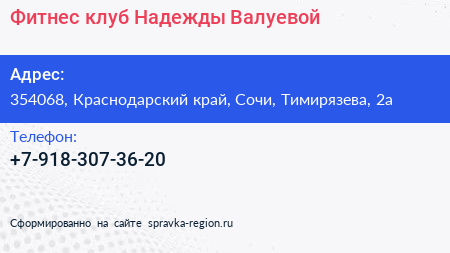 Фитнес-клуб Надежды Валуевой по адресу 354068, Краснодарский край, Сочи, Тимирязева, 2а в дальнейшем Организация, размещена в следующих категориях: