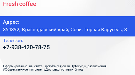 Fresh coffee по адресу 354392, Краснодарский край, Сочи, Горная Карусель, 3 в дальнейшем Организация, размещена в следующих категориях: