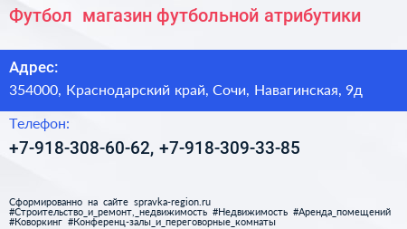 Футбол+, магазин футбольной атрибутики по адресу 354000, Краснодарский край, Сочи, Навагинская, 9д в дальнейшем Организация, размещена в следующих категориях: