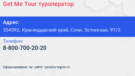 Get Me Tour, туроператор по адресу 354392, Краснодарский край, Сочи, Эстонская, 97/3 в дальнейшем Организация, размещена в следующих категориях: