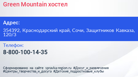 Green Mountain, хостел по адресу 354392, Краснодарский край, Сочи, Защитников Кавказа, 120/3 в дальнейшем Организация, размещена в следующих категориях: