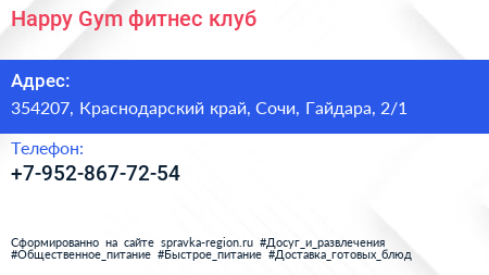 Happy Gym, фитнес-клуб по адресу 354207, Краснодарский край, Сочи, Гайдара, 2/1 в дальнейшем Организация, размещена в следующих категориях: