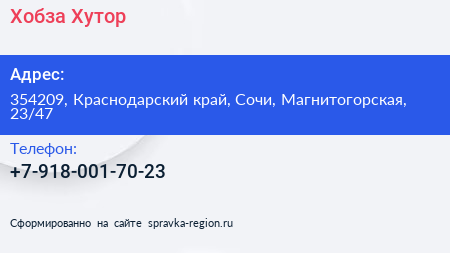Хобза Хутор по адресу 354209, Краснодарский край, Сочи, Магнитогорская, 23/47 в дальнейшем Организация, размещена в следующих категориях: