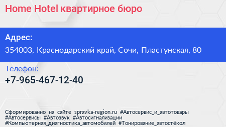 Home Hotel, квартирное бюро по адресу 354003, Краснодарский край, Сочи, Пластунская, 80 в дальнейшем Организация, размещена в следующих категориях: