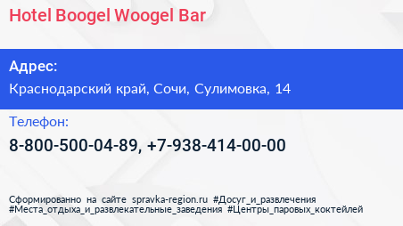 Hotel Boogel Woogel Bar по адресу Краснодарский край, Сочи, Сулимовка, 14 в дальнейшем Организация, размещена в следующих категориях: