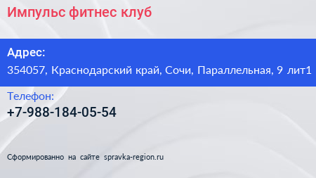 Импульс, фитнес-клуб по адресу 354057, Краснодарский край, Сочи, Параллельная, 9 лит1 в дальнейшем Организация, размещена в следующих категориях: