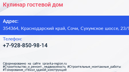 Кулинар, гостевой дом по адресу 354364, Краснодарский край, Сочи, Сухумское шоссе, 23/9 в дальнейшем Организация, размещена в следующих категориях: