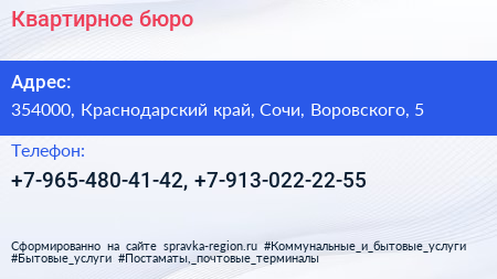 Квартирное бюро по адресу 354000, Краснодарский край, Сочи, Воровского, 5 в дальнейшем Организация, размещена в следующих категориях: